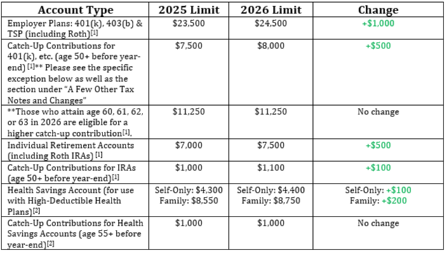 The 2026 numbers in the chart highlight several meaningful shifts across retirement and healthcare programs, including higher contribution limits, updated thresholds that may affect you as either a current or future retirees. These changes create new planning opportunities, as well as potential pitfalls, for anyone looking to maximize savings, manage taxes, or coordinate benefits. As always, let us know if you’d like to talk through how these updates may impact your personal financial situation.