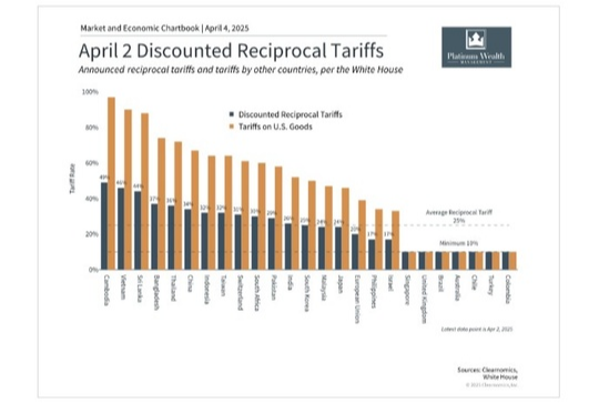 Federal Reserve Chair Jerome Powell said today he expects President Donald Trump's current tariff policy will hike prices and slow economic growth, while noting that key indicators "still show a solid economy." As we know, President Trump announced new tariffs on nearly all major trading partners. These tariffs are “reciprocal” in that they correspond to tariffs each country imposes on U.S. goods and are on top of previously announced duties. The average tariff rate across countries is 25%, with rates for some as high as 49%. While the implementation of these tariffs was widely telegraphed by the White House, the level and scope are greater than many investors and economists expected. The immediate market reaction was negative, with the S&P 500 declining over 3% and the 10-year Treasury yield declining to around 4%.