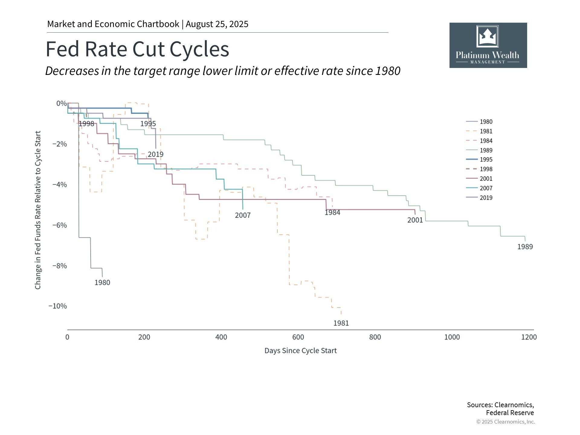 The included chart shows the Fed's historical rate cut cycles, demonstrating how the central bank has adjusted monetary policy many times over the past 50 years in response to changing economic conditions.